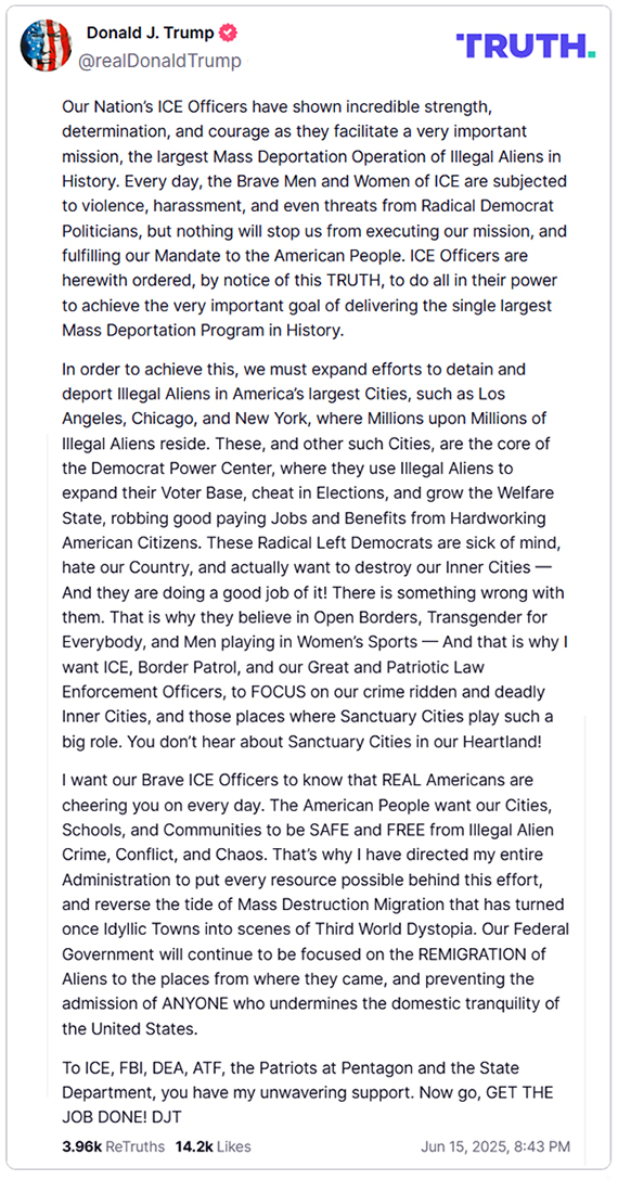 “ICE Officers are herewith ordered, by notice of this TRUTH, to do all in their power to achieve the very important goal of delivering the single largest Mass Deportation Program in History,” he wrote.