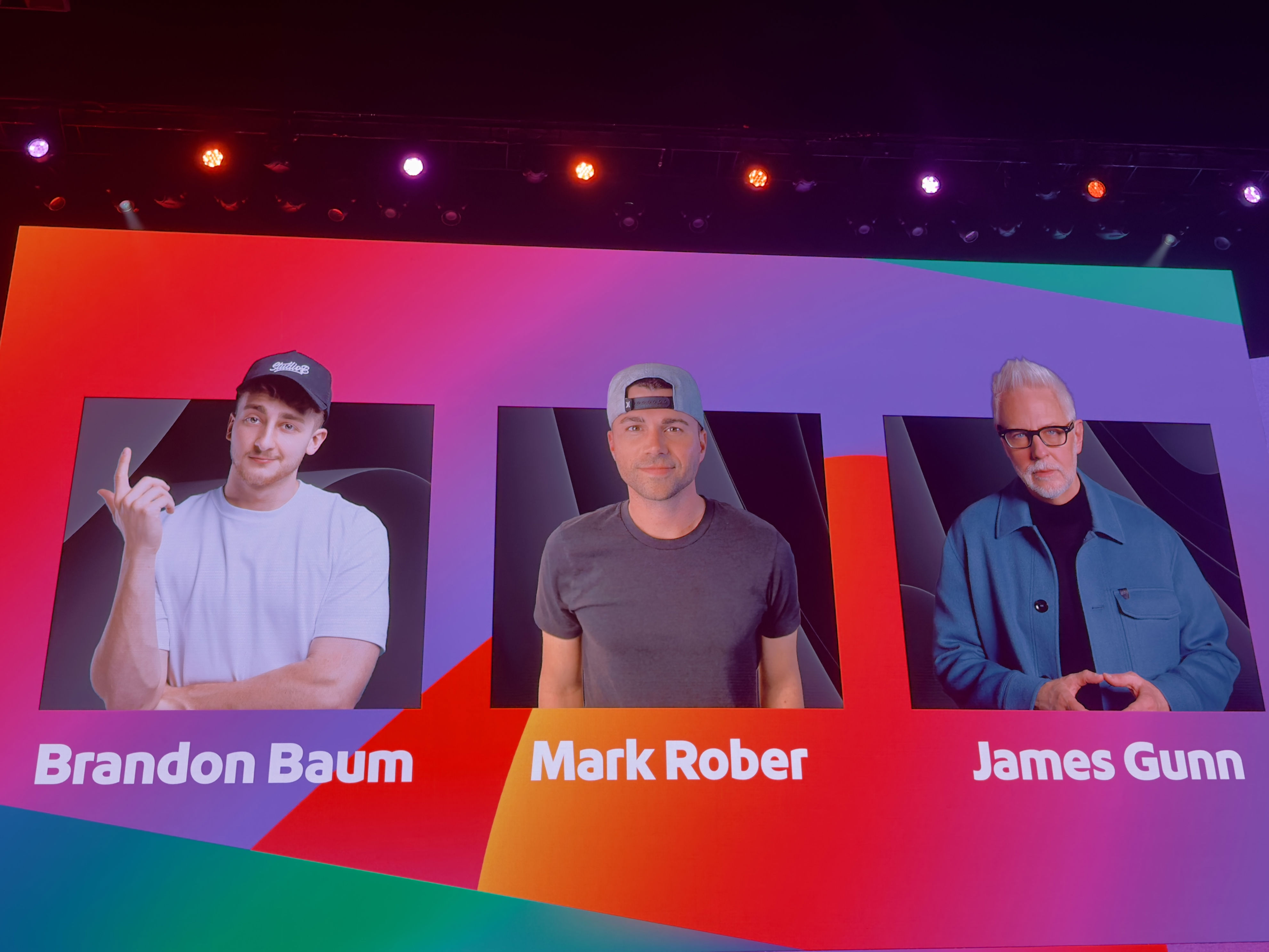 Brandon Baum delivers a live demo showcasing his work with Adobe Express. Mark Rober and James Gunn also speak, highlighting the importance of storytelling and the role of AI in enhancing creativity.