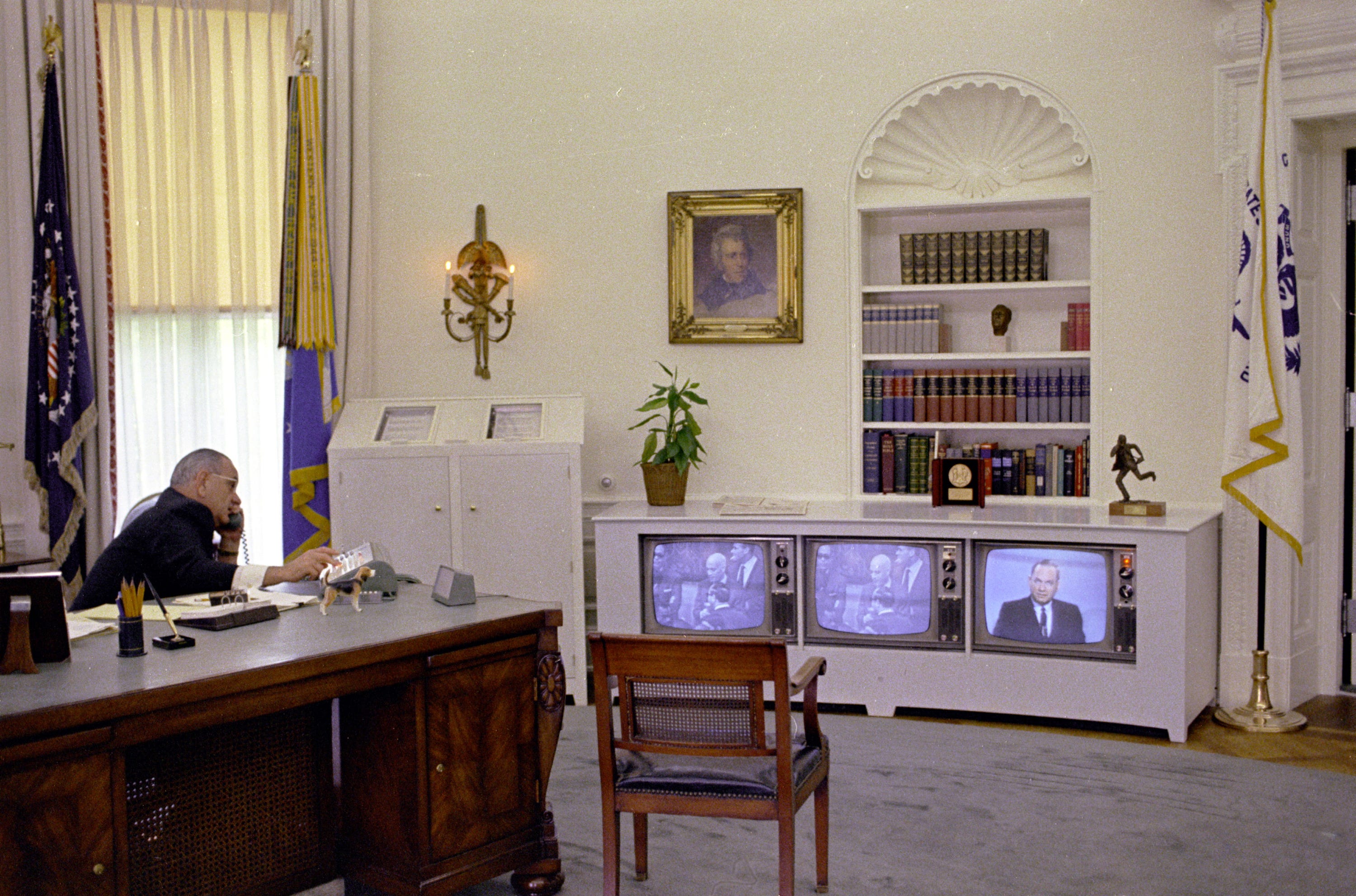 In the 1950s, the number of American households with television sets soared from 9% to nearly 90%. President Lyndon Johnson was the first to fully embrace television as a tool for speaking to the public and monitoring news. He even had a three-television unit installed in the Oval Office.
