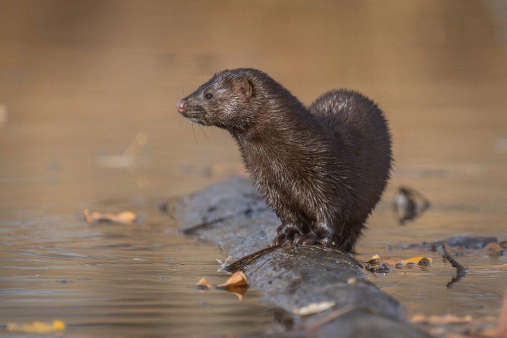 American mink are naturally shy and often hard to spot. You’re more likely to spot evidence of their presence, like burrows or tracks, rather than the mink itself. They live in dens, usually in holes along the riverbank or under tree roots. River mink weigh between 1.5 to three pounds and stand just under four inches at their shoulder. Their bodies are long and slender, with males significantly larger than females. Fish make up a significant portion of their diet. They also eat muskrats, squirrels, rabbits, rats, and mice.