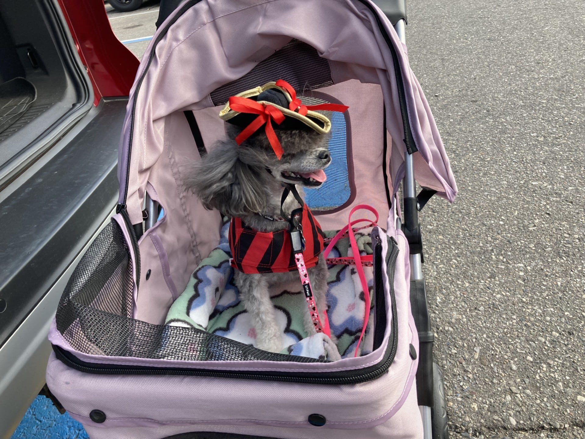 Roxie is fearless in a tricorne. Danna Smith, of Canton, dressed 3-year-old Roxie in a black-and-red costume with a pirate's hat that, honestly, had a hard time staying put when she took the poodle out to get a professionally taken picture. The outfit was a hand-me-down from her beloved dog, Sophie, who is no longer with us. Smith doesn't remember what she originally paid.