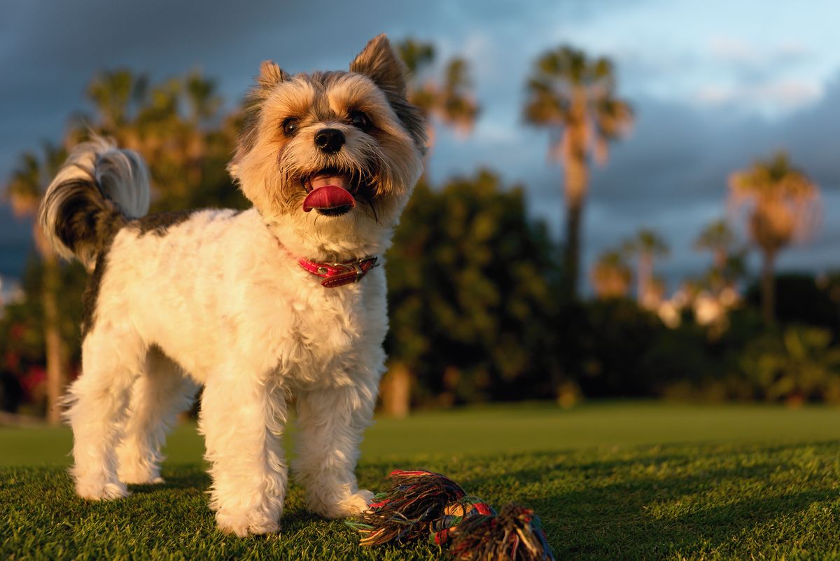 The Biewer Terrier may look like a Yorkie, but its coat is distinct. These affectionate and playful dogs weigh around 6 pounds.
