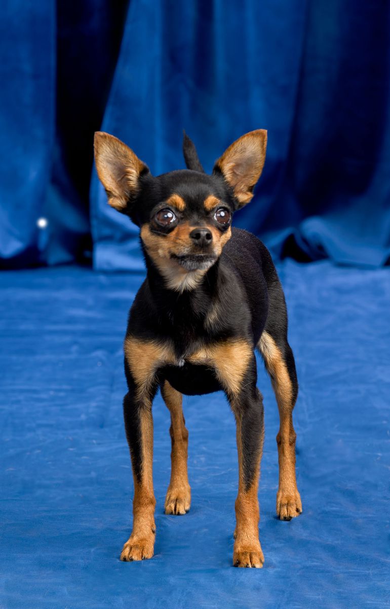 Measuring between 10 and 12 inches and weighing between eight and 10 pounds, Miniature Pinschers are often referred to as the "King of Toys." These pups have shiny coats, with colors ranging from black and rust, black and tan, chocolate and tan, and chocolate and rust to red and stag red. They also have a distinguished stride akin to a horse's trot.