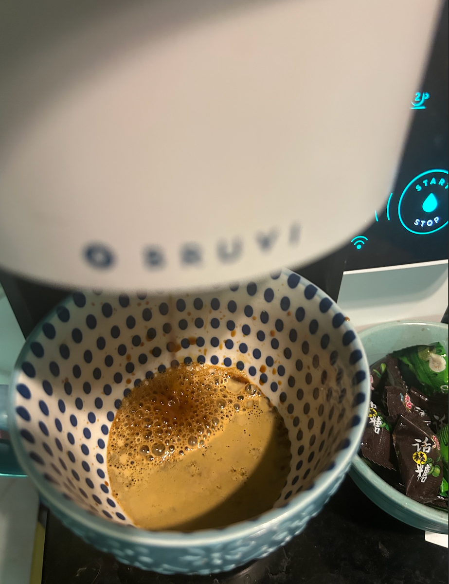 My first impression of the Bruvi was its sleek, modern look, with light wood accents and an illuminated touchscreen panel. Like other single-serve machines, it’s incredibly easy to use—just insert a pod, make a few quick selections, and you’ll have a hot cup of coffee in minutes. I appreciated the range of drink options, including espresso, cold brew, iced coffee, and Americano, as well as the ability to adjust temperature and size. I also appreciated the unique “low-acid” setting, which is perfect for coffee drinkers like me who can’t tolerate overly acidic brews. Of course, a good first impression only matters if the coffee tastes great—and that’s where it really counts.