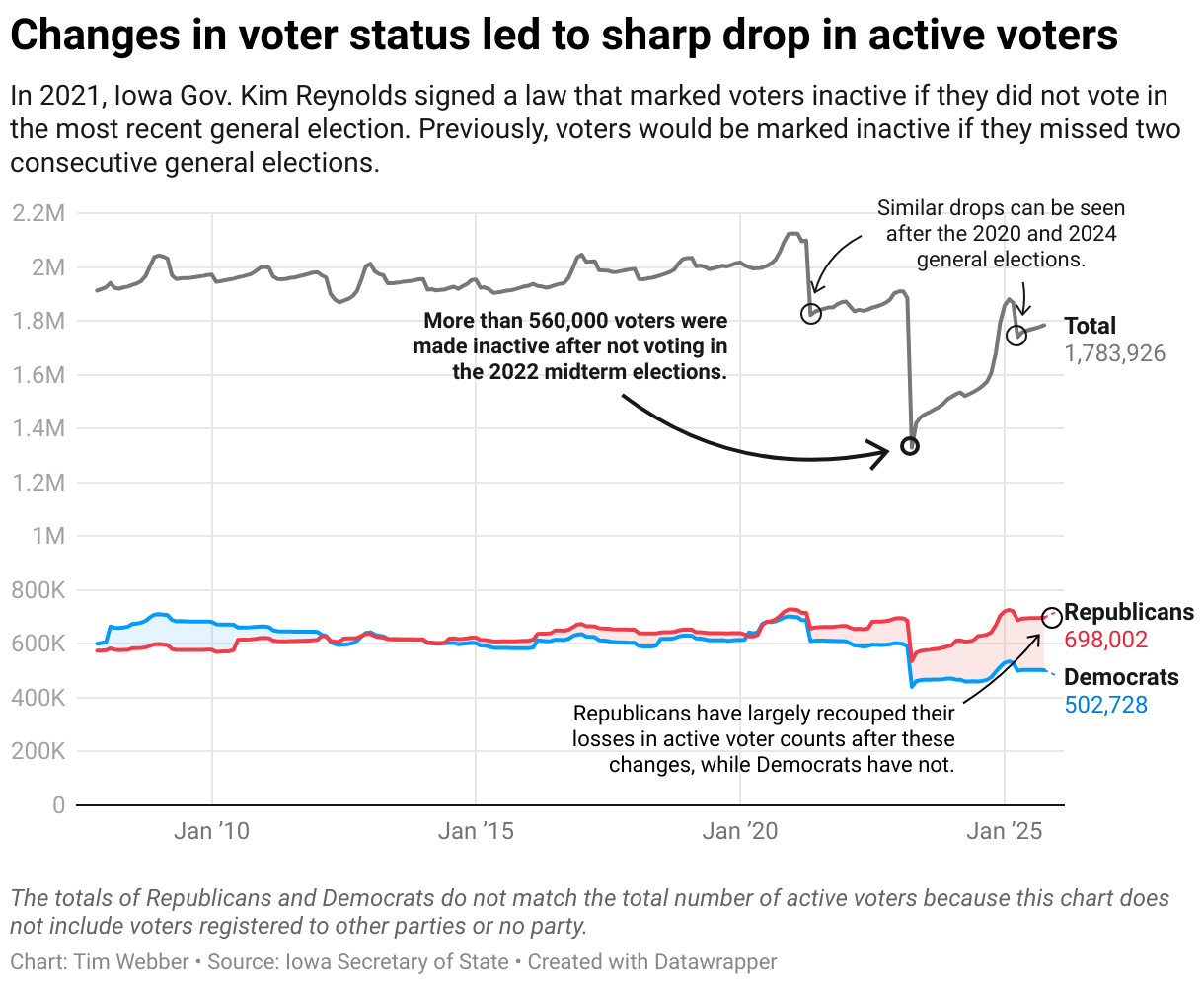 About 16% of Iowans, or about 340,000 Iowans, who are registered to vote in Iowa currently have inactive status. They can still vote, but they risk having their registration canceled if they remain inactive by not casting a ballot. (Registrations may also be canceled if an individual moves, dies or commits a felony, among other reasons.) The number of inactive voters is much higher than in the 2000s and 2010s because of a change to state election law Gov. Kim Reynolds signed in 2021. The portions of the legislation that grabbed headlines included reducing the amount of time Iowans can vote and imposing additional restrictions on how and when absentee ballots are submitted. But the new law also required any voter who does not participate in a general election to be designated as inactive. Previously, voters would have had to miss two consecutive general elections before that happened. That change resulted in more than 560,000 voters moved to “inactive” status after the 2022 general election. Similar drops, though not as large, occurred after the 2020 and 2024 general elections.