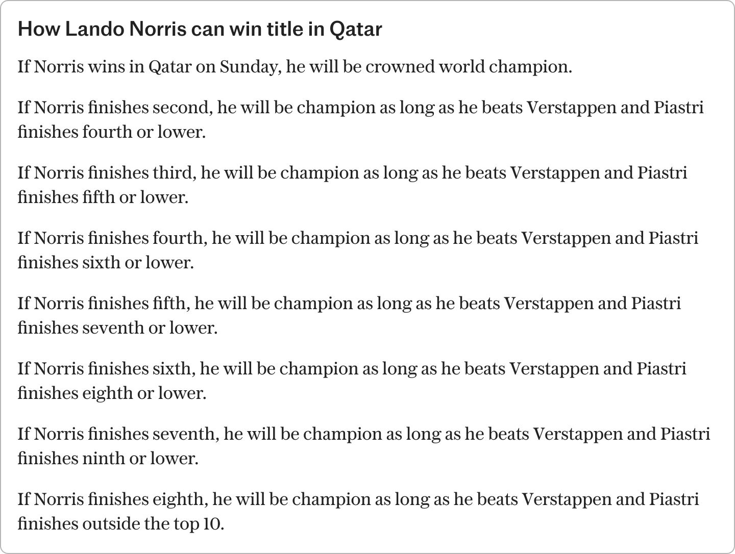 If Norris wins the race tomorrow, he will be world champion. If he finishes the weekend 26 points or more clear of Piastri and Verstappen, he will also be world champion. Currently, he is 22 points ahead of Piastri and 25 points clear of Verstappen.