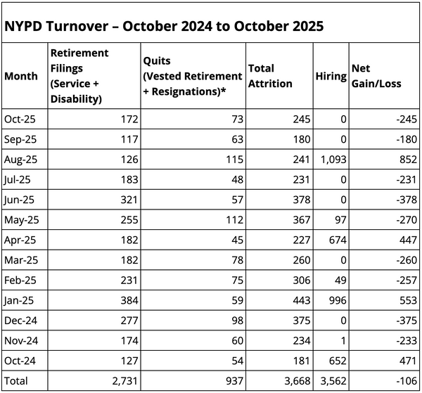 While there have been reports of declining numbers within the NYPD, these trends predate Mamdani’s election. According to data from the Police Benevolent Association, the department experienced a net loss of 106 officers in October 2025 compared to the same month in 2024. Over the course of the year, 3,668 officers left the department, while 3,562 joined.