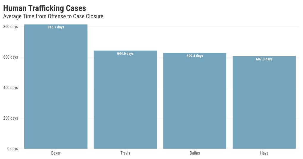 Our team found more than 90 human trafficking cases still pending in the counties we analyzed. Victims in these cases have been waiting an average of more than 530.5 days for closure since their alleged offenses occurred. It took an average of 674 days to reach a final disposition for closed cases in those counties.