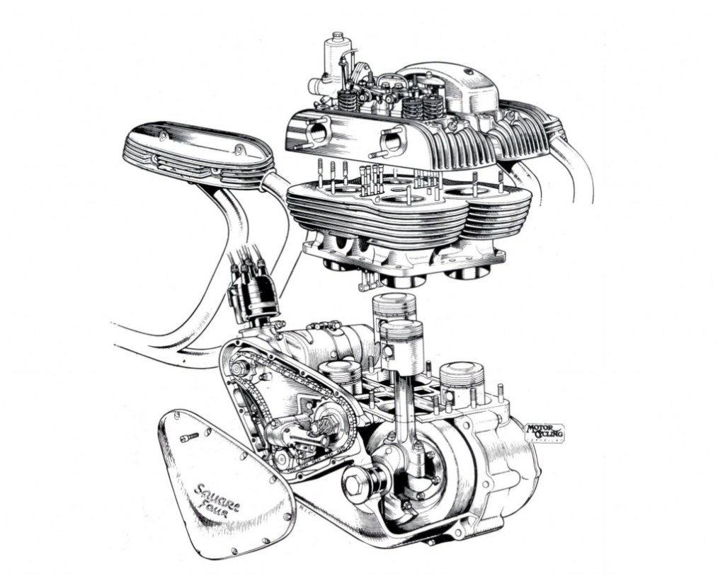 The idea for a square-four engine came from Edward Turner in 1928, who, at the time, was managing a Velocette dealership in London. He was eventually hired by Ariel, who offered a bike with a square-four for the first time in 1931. Here’s how it worked: