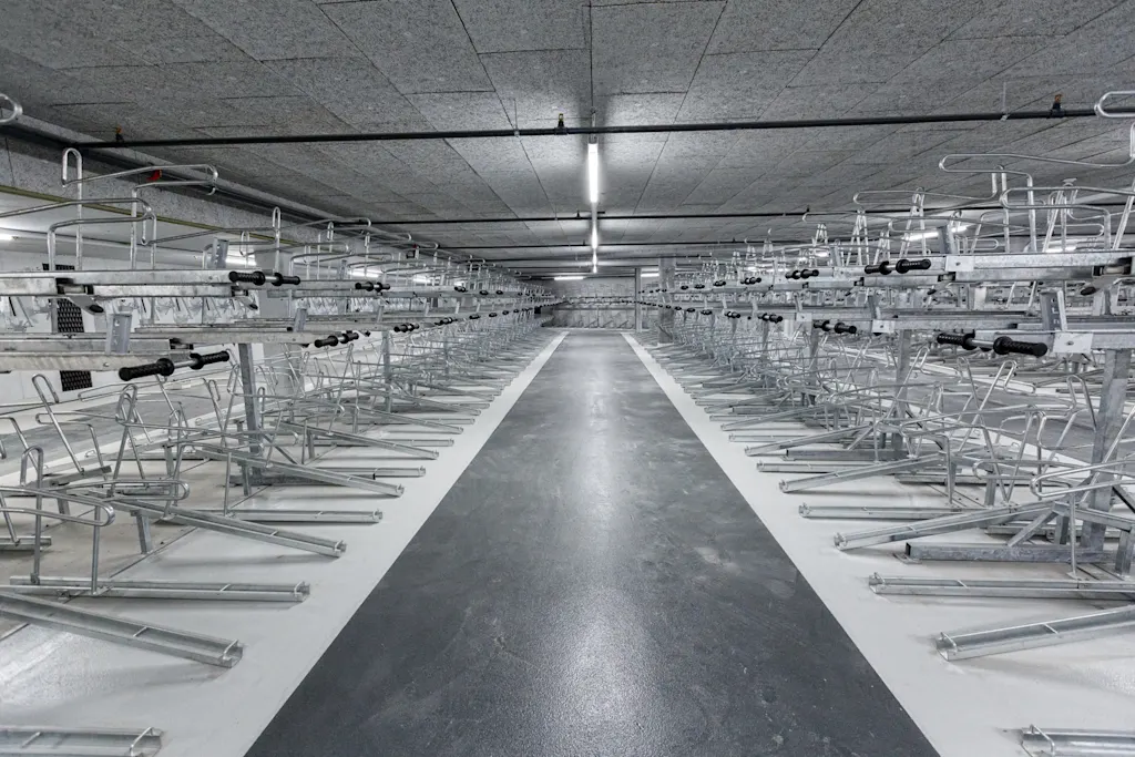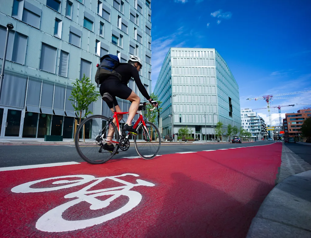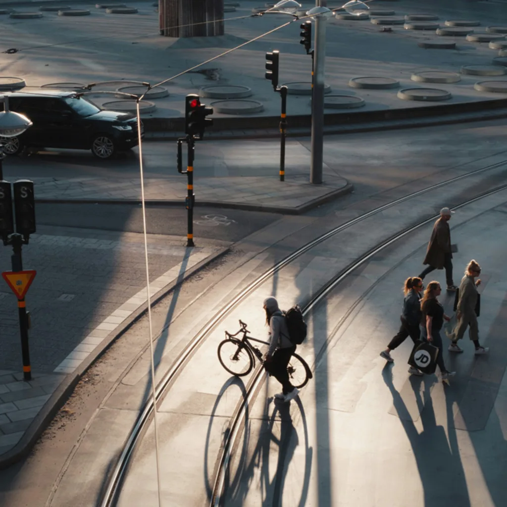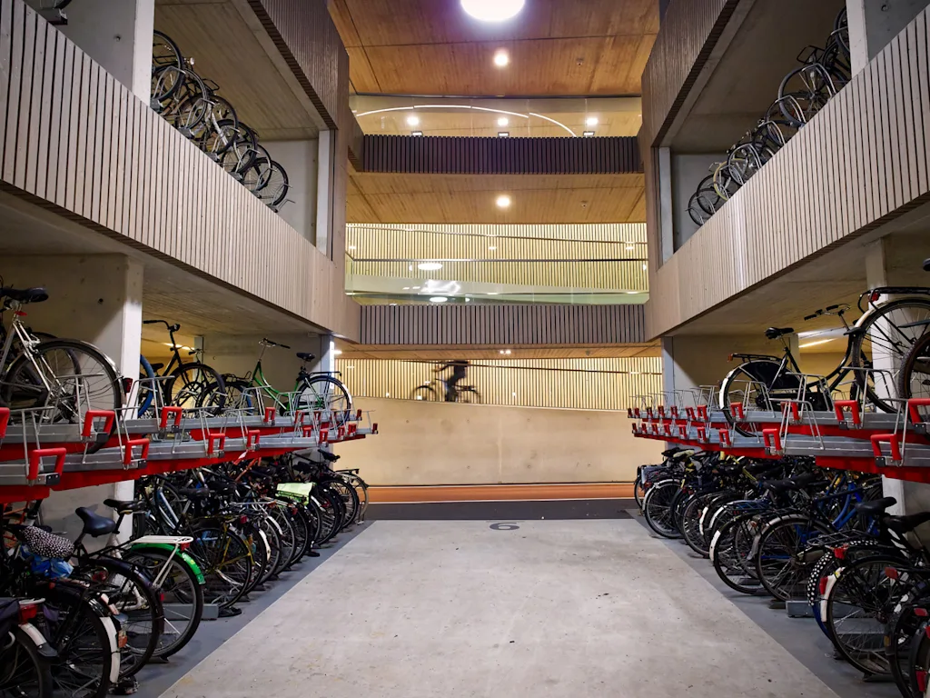 Malmö’s bike mode share reached 27% in 2024, supported by a dense network with 49 kilometers (30 miles) of protected lanes per 100 kilometers (62 miles) of road. A new regional bike highway is adding underpasses and bridges to close gaps. The city provides extensive parking—including 5,000 spaces at train stations—plus air pumps, footrests, and school streets. Cargo bikes are common, and developers are encouraged to include bike pools in new housing.