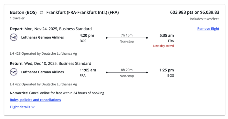 Switching our focus to flights, my favorite transfer partners for getting outsize value include Air Canada Aeroplan, Air France-KLM Flying Blue, and The British Airways Club. For example, you can book this round-trip business class ticket from Boston (BOS) to Frankfurt (FRA), Germany, for 120,000 Aeroplan points and $244 in taxes and fees.