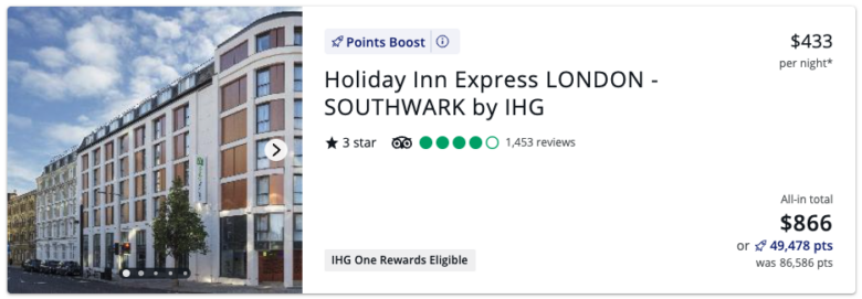 But don’t expect to get 2 cents per point on all Points Boost hotel bookings. Next July, a 2-night stay at the Holiday Inn Express London Southwark costs $866 on this example date. With Points Boost, you could redeem 49,478 Ultimate Rewards points for 1.75 cents per point in value.
