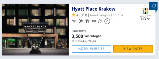 On the hotel side, I like transferring Ultimate Rewards points to World of Hyatt, as it has a fixed award chart with free nights starting at 3,500 points per night on off-peak nights. For example, you can book a 1-night stay at the brand new Hyatt Place Krakow in Poland for 3,500 points at the end of April. This same stay costs $91.62 after taxes and fees, giving you 3 cents per point in value.