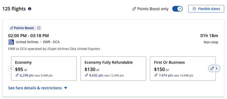 For example, I searched Chase Travel for one-way flights from New York City to Washington, D.C., and toggled the Points Boost only filter. This United flight from Newark (EWR) to Washington, D.C. (DCA) offers 1.5 cents per point in value for standard economy fares and a whopping 2 cents per point towards a first-class ticket — the same or better than the old redemption rate.