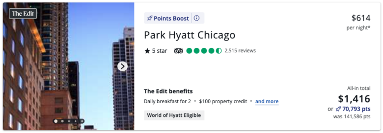 You’d get similar value on this weekend stay at the Park Hyatt Chicago, another hotel with The Edit, next June. This 2-night stay costs $1,416 after taxes and fees, or you can spend 70,793 Ultimate Rewards points for the same room. As with the St. Regis above, this redemption yields a value of 2 cents per point.