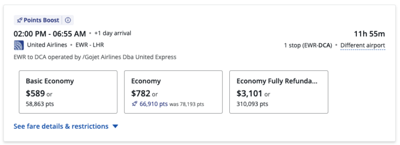 But not all Points Boost redemptions are this good. This United flight from Newark (EWR) to London Heathrow (LHR) costs $782 or 66,910 Ultimate Rewards points and yields just over 1.1 cents per point in value.