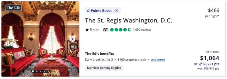 For example, next May, 2 nights at The St. Regis Washington D.C. cost $1,064 after taxes and fees. Alternatively, you could book with Points Boost and spend 53,221 Ultimate Rewards points for 2 cents per point in value. Since this hotel is a member of The Edit, you’d also get on-site perks like complimentary breakfast, space-available room upgrades, and a $100 property credit.