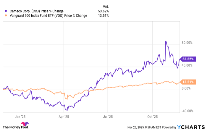 Investors have shown strong interest in Cameco, with its stock price rising significantly over the past few years. Over the past year, the stock has gained over 50%, compared to a roughly 13% increase in the S&P 500 index. Over five years, the stock has surged by more than 770%, far outpacing the broader market.