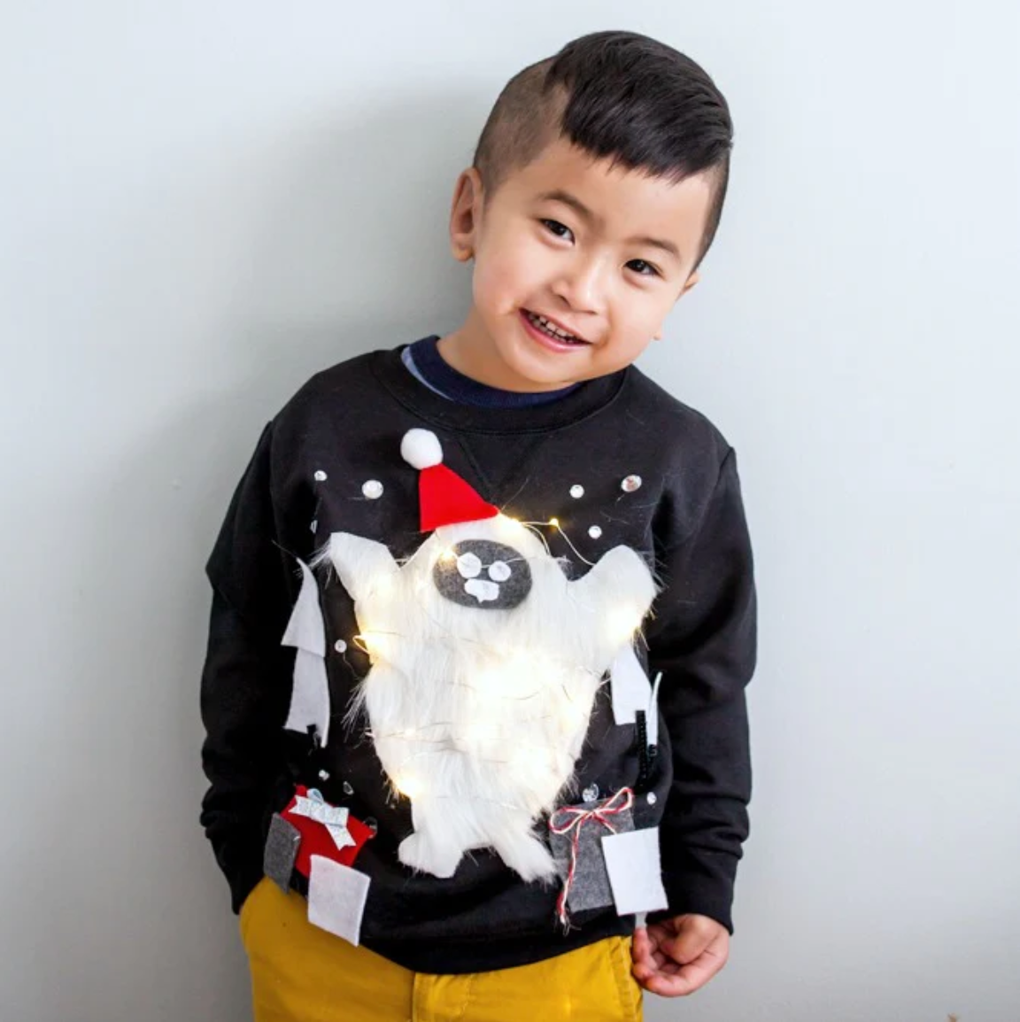 This quirky design features a goofy yeti face adorned with twinkling holiday lights. It's perfect for those who want to stand out at any holiday gathering.