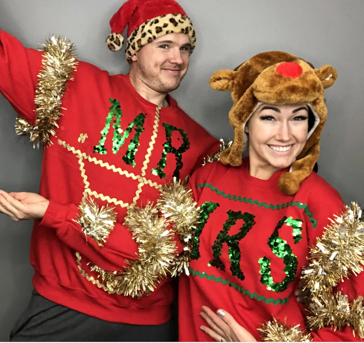 Perfect for couples, these sparkly matching sweaters feature tinsel and sequins for a festive touch.
