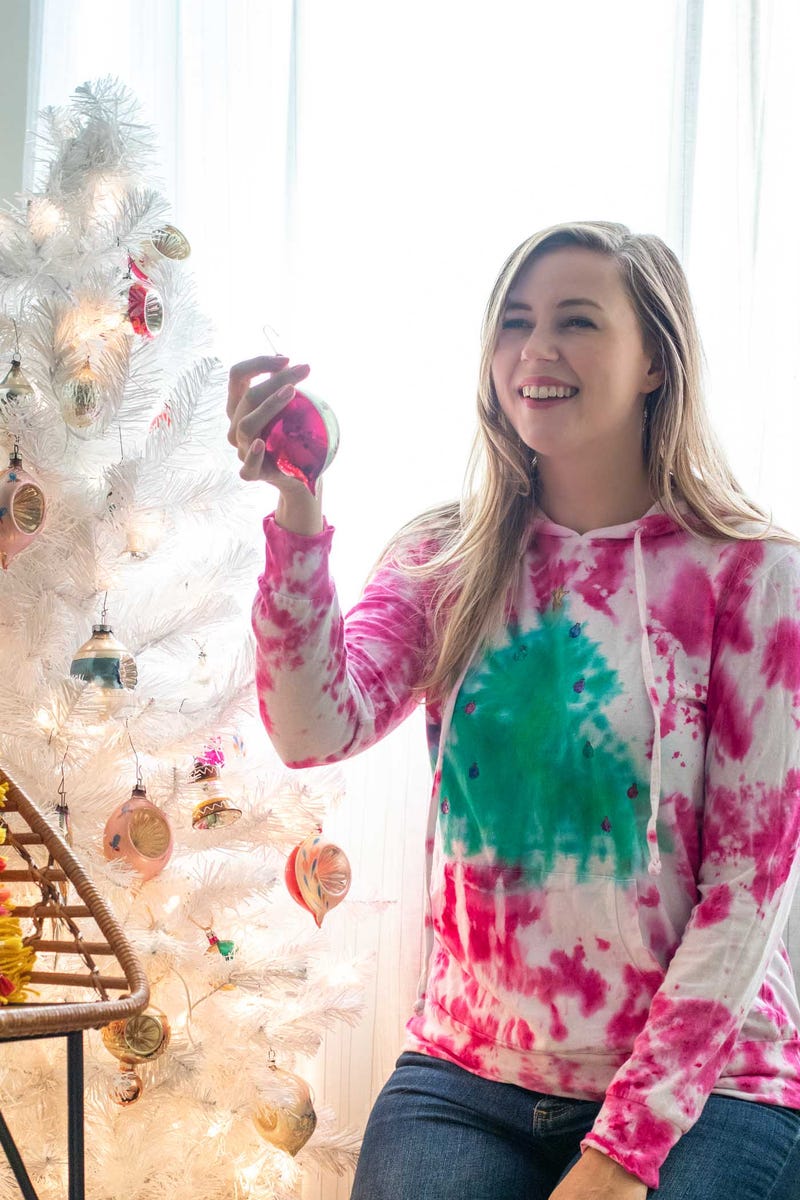 A groovy twist on a classic design, this sweater uses tie-dye techniques to create a festive tree pattern. Add hand-painted Christmas lights for extra whimsy.